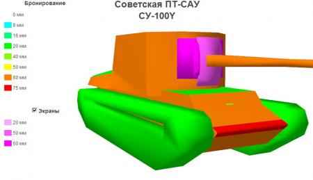 Что такое СУ-100Y? Это боевая машина с массой 64 тонны и очень большими размерами. Её длина – более 10м, а ширина и высота – более 3м. Бронирование СУ-100Y имеет толщину 60мм во всех проекциях, кроме днища и крыши. Всю эту махину передвигает двигатель мощностью в 890 лошадиных сил, а максимальная скорость составляет 32 км/ч по шоссе и 12 км/ч по пересеченной местности.